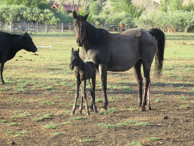Slept well through a night of, rain, thunder and lightning. Woke to a brand new baby colt in the field behind my house. Blue, the mare, probably had Thunder about an hour earlier and was still with afterbirth. Baby Thunder looks just like mom Blue and is very tall.